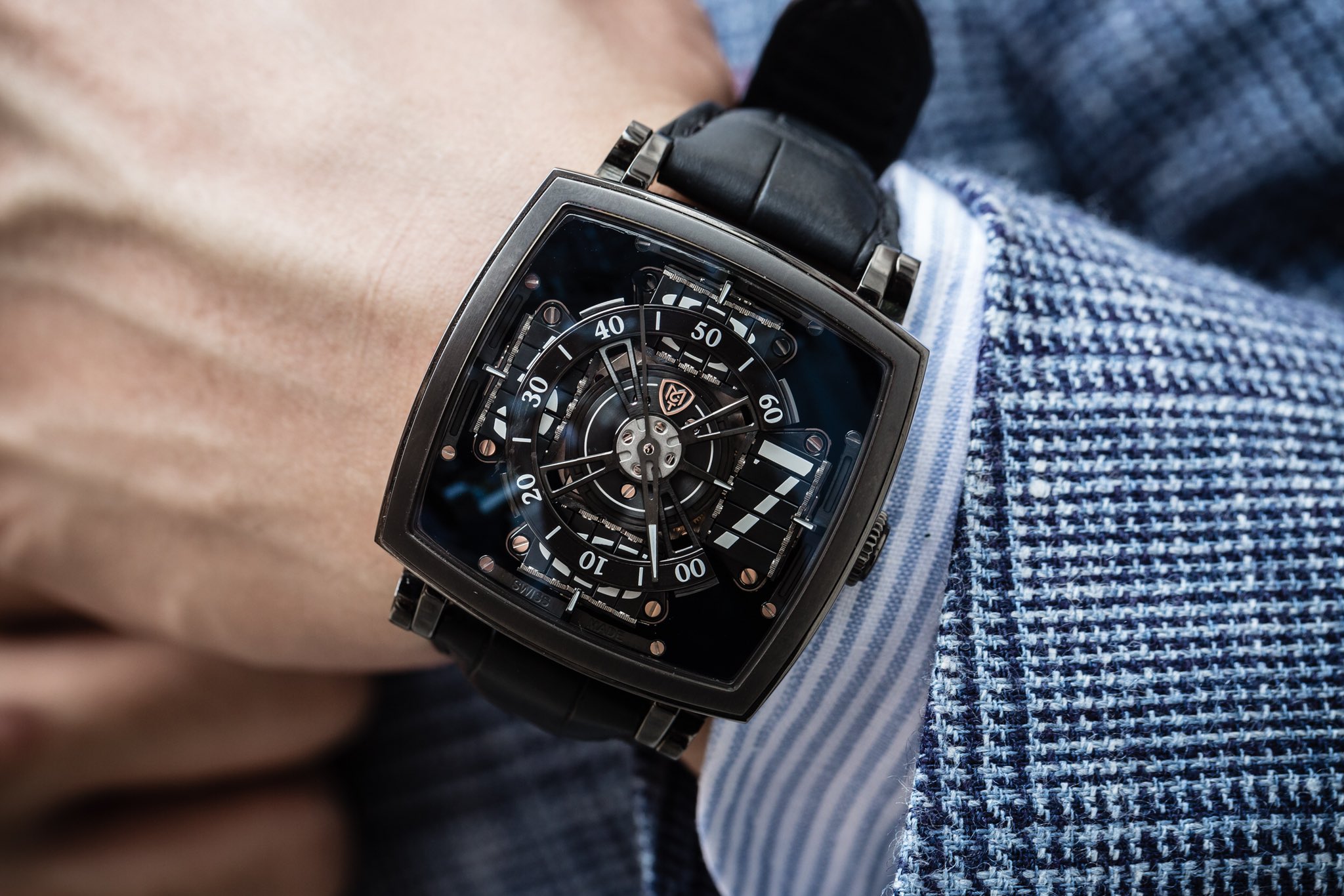 217x318 - The watch case measures 45 millimeters x 45 mm x 15.5 mm thick, and is crafted out of titanium with black dlc coating, as is the buckle with folding clasp.