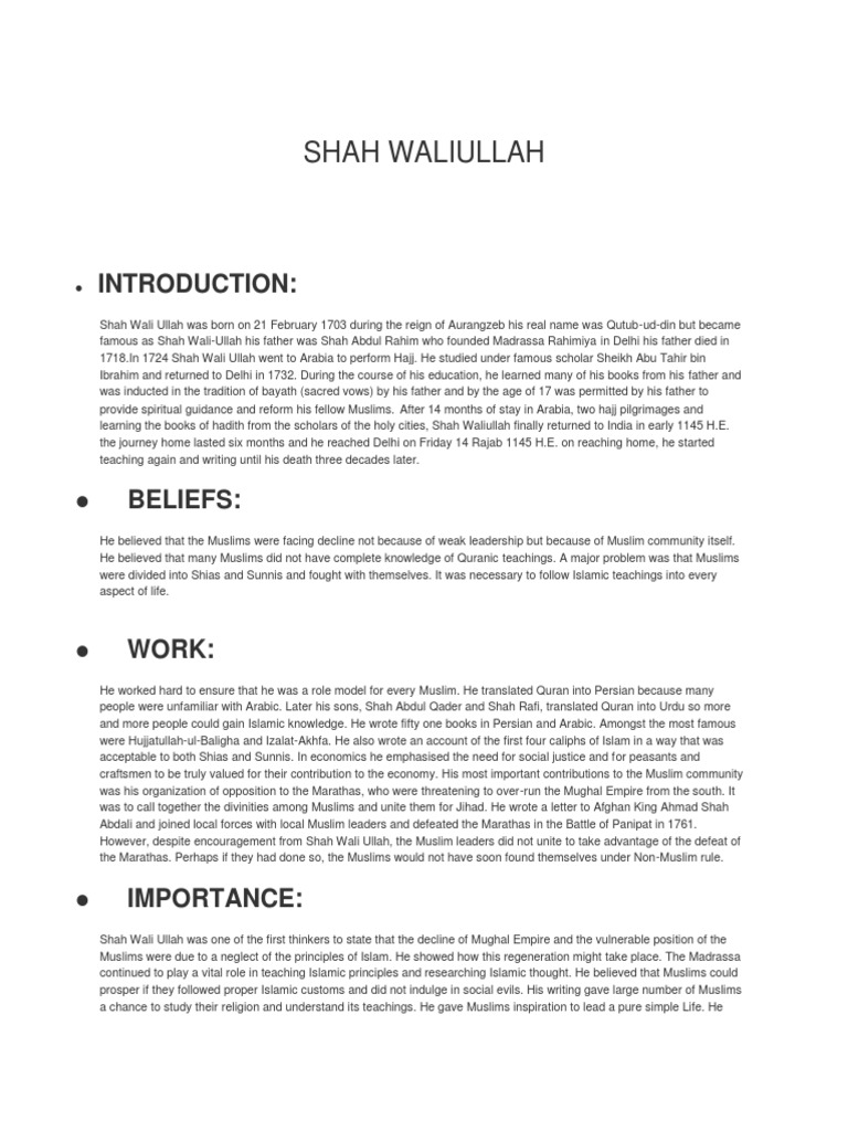 Real Name Of Shah Waliullah : Shah waliullah was the first in the subcontinent to translate the qur'an into the persian language that was widely spoken among the learned circles in india at that time.